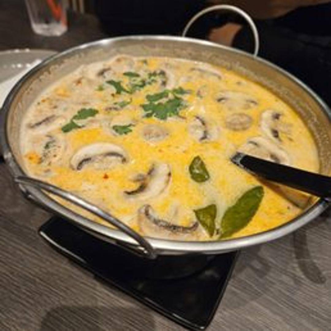 A creamy and fragrant coconut milk soup with chicken, lemongrass, galangal, kaffir lime leaves, mushrooms, and chili peppers. Mildly spicy and flavorful.