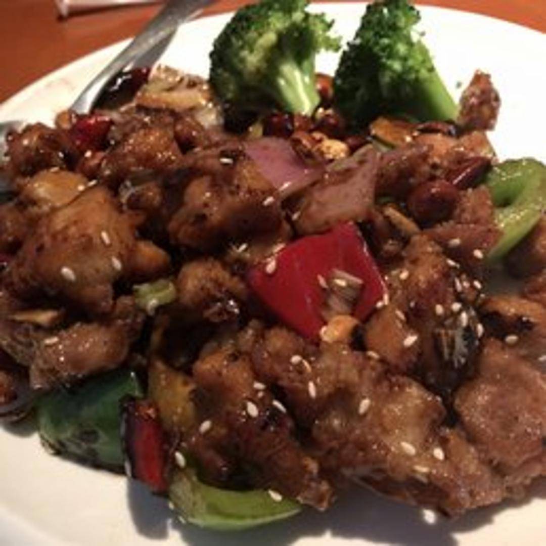 Diced chicken stir-fried with peanuts, dried chilies, and Sichuan peppercorns in a sweet, savory, and spicy sauce. Garnished with scallions. Served with rice.