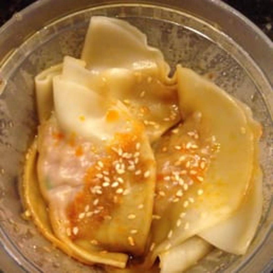 Pork dumplings served in a flavorful and spicy sauce, typical of Chengdu cuisine. Garnished with chili oil and sesame seeds.