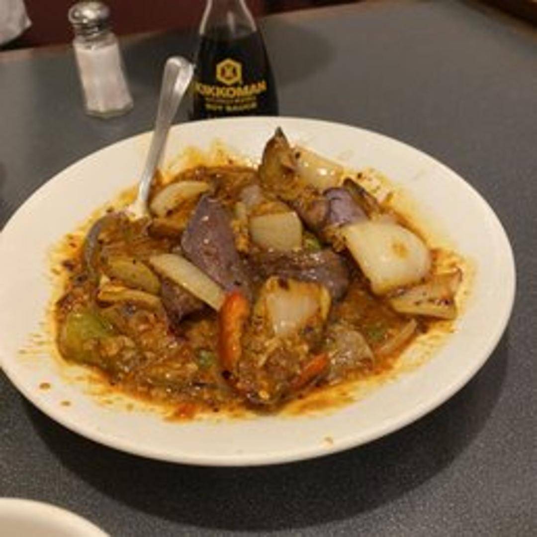 Stir-fried Chinese eggplant cooked with fresh basil. A vegetarian dish featuring tender eggplant and aromatic basil, seasoned with savory sauces and spices for a flavorful combination.
