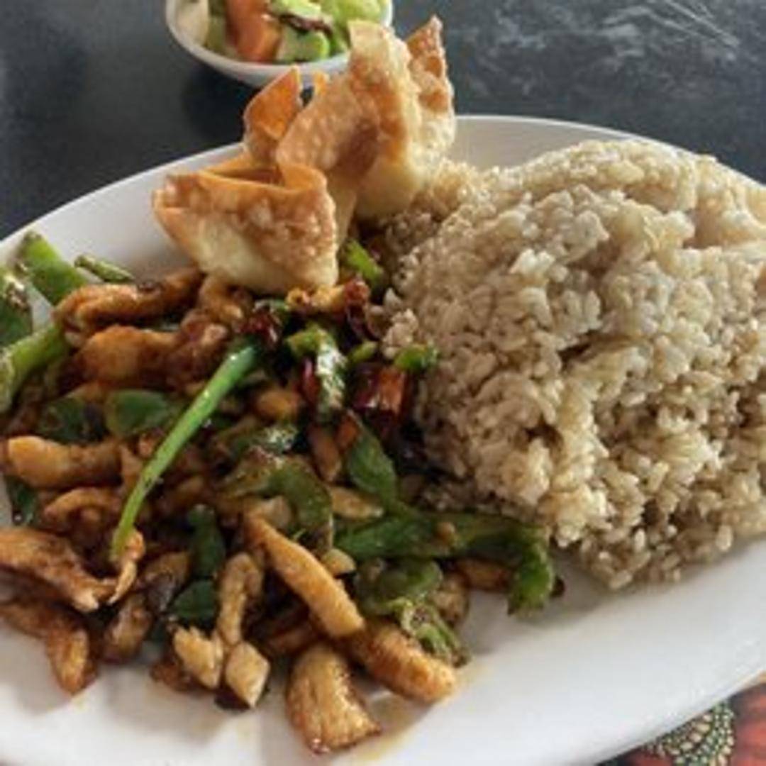 Diced chicken stir-fried with dried chili peppers, cayenne pepper, and other spices for a smoky and fiery flavor. A signature Sichuan dish known for its intense heat and complex aroma.