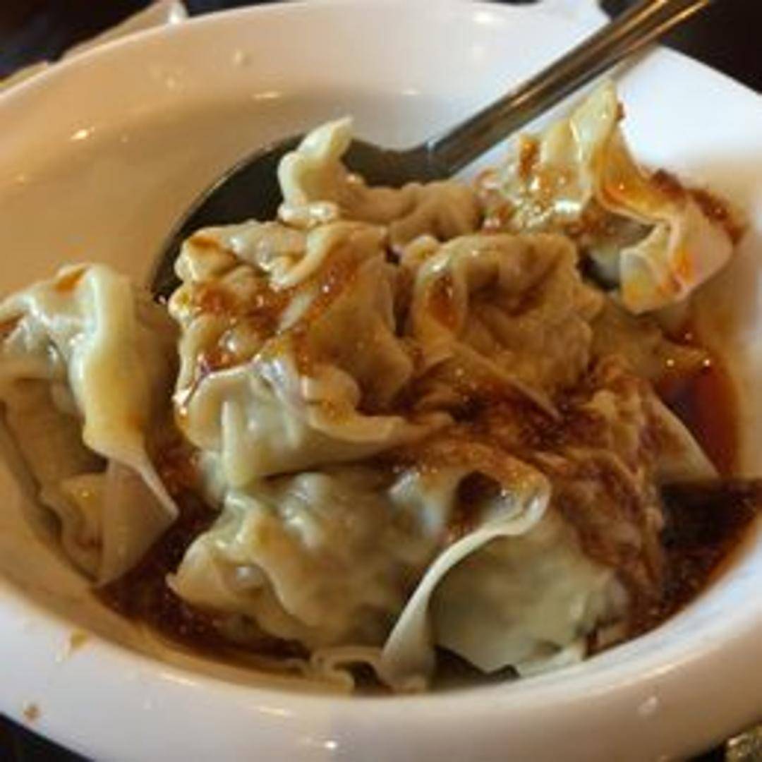 Pork-filled wontons bathed in a flavorful and spicy Sichuan chili oil sauce, garnished with sesame seeds and scallions.