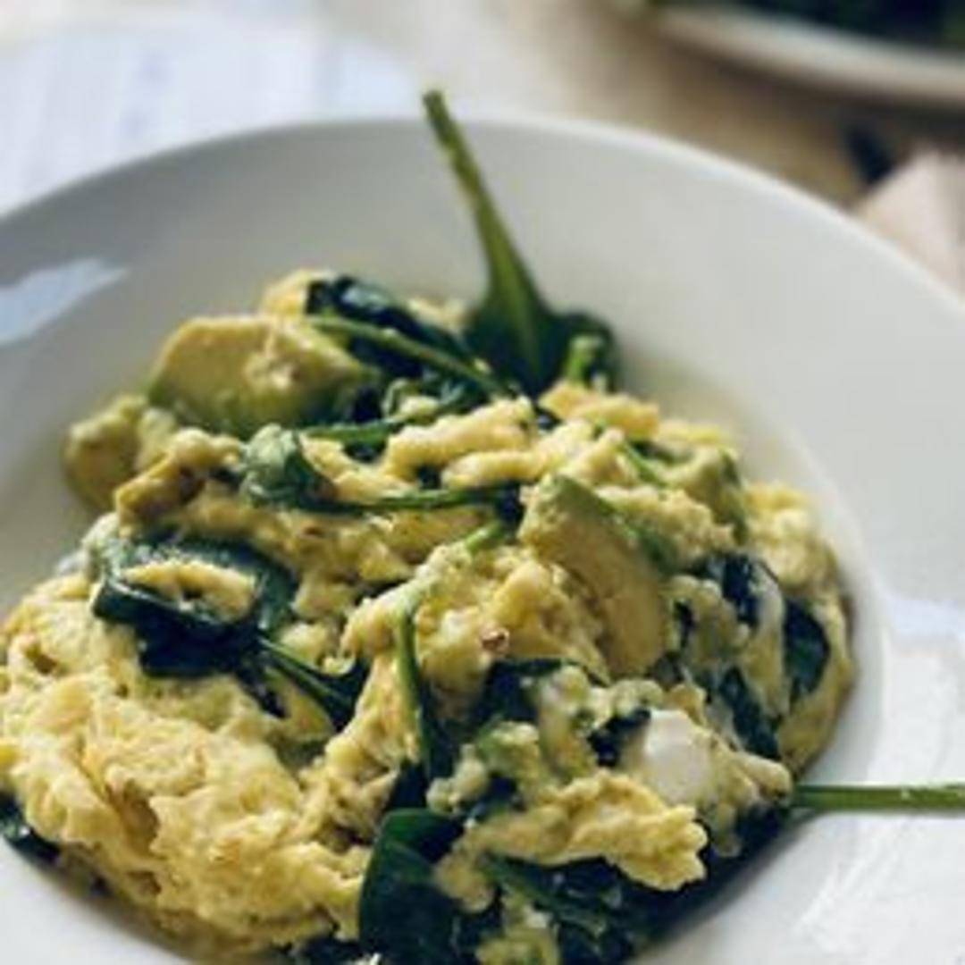A hearty scramble of fresh seasonal vegetables, including bell peppers, onions, mushrooms, and spinach, folded with fluffy scrambled eggs. Served with a side of whole-wheat toast and fresh fruit.