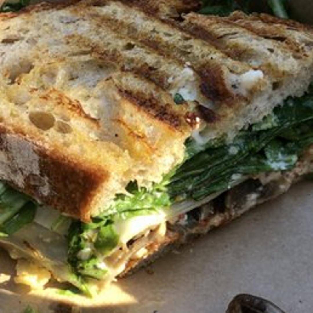 Grilled panini bread filled with a medley of roasted vegetables, such as zucchini, bell peppers, and eggplant, along with fresh mozzarella cheese and a flavorful pesto spread.