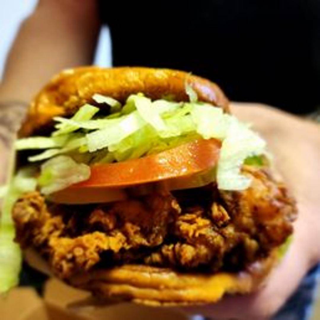 Crispy buttermilk-battered chicken breast, lettuce, tomato, and your choice of sauce on a toasted bun.
