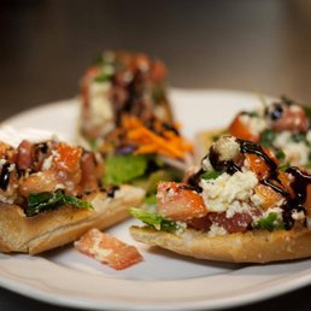 Toasted slices of Italian bread topped with fresh diced tomatoes, basil, garlic, and a drizzle of balsamic glaze.