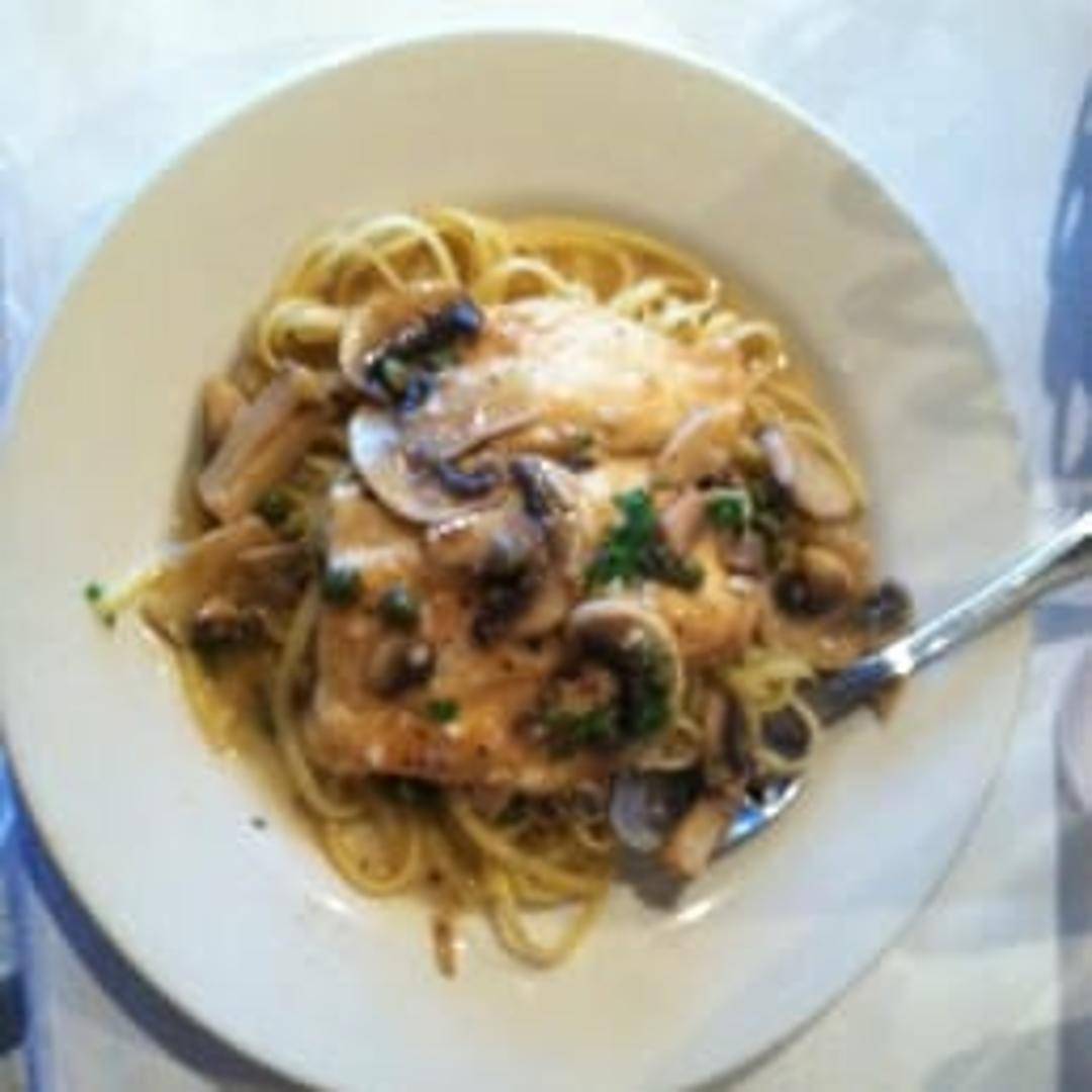 Sautéed chicken breast in a lemon-butter and caper sauce. Served with a side of spaghetti.