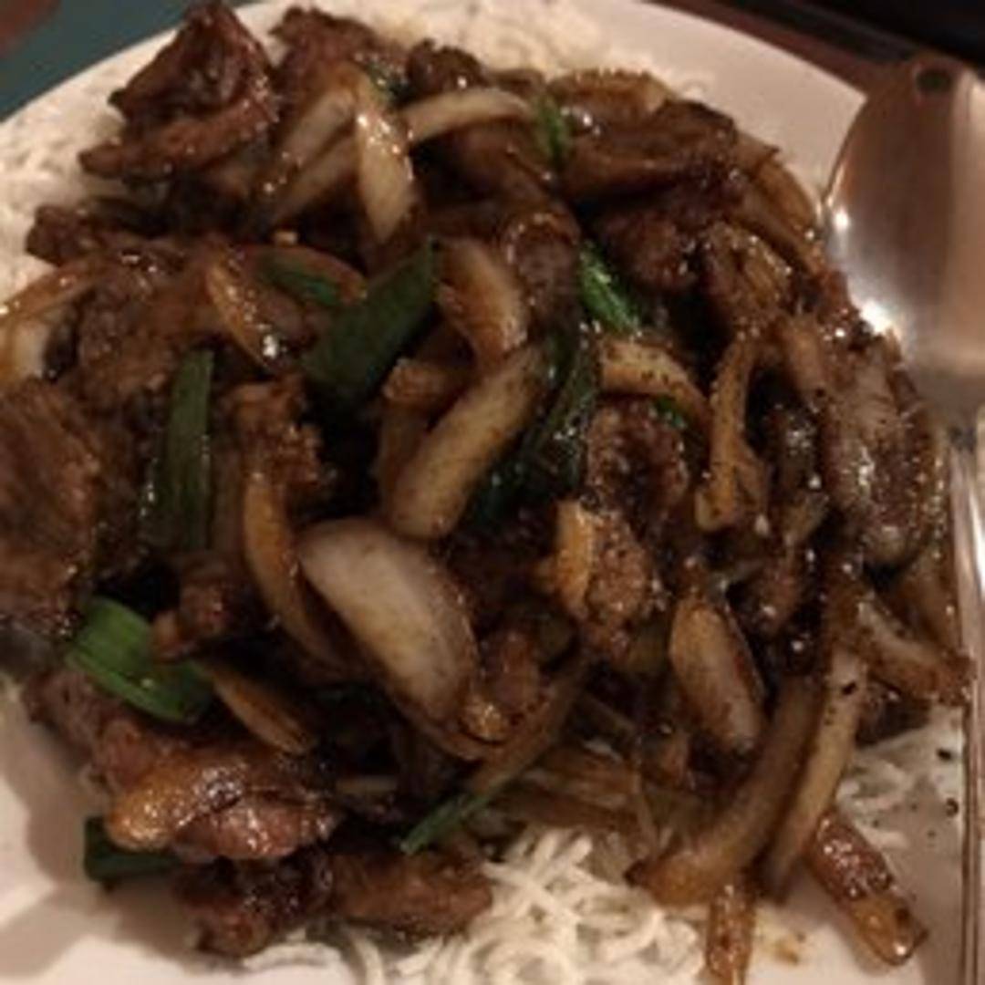 Tender slices of beef stir-fried with scallions and onions in a sweet and savory Mongolian sauce. Served over a bed of crispy rice noodles.