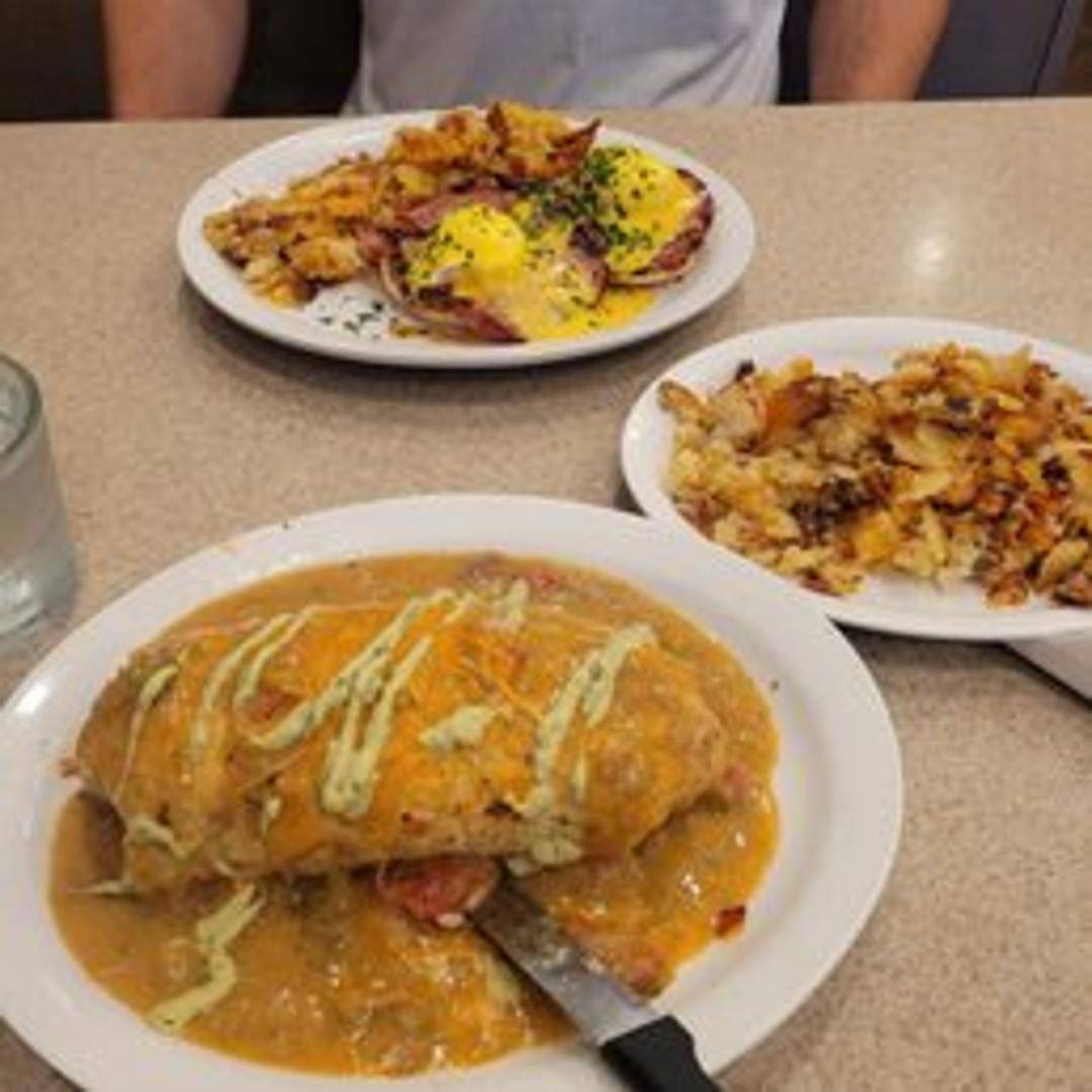 A large flour tortilla filled with scrambled eggs, cheese, potatoes, and your choice of meat (bacon, sausage, or chorizo). Smothered in your choice of green chili or gravy. Served with a side of sour cream and salsa.