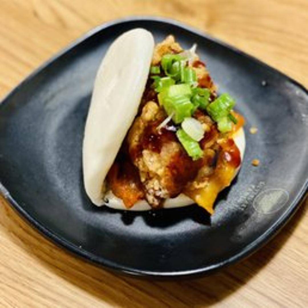 A steamed bun filled with spicy fried chicken, often accompanied by toppings like pickles and a spicy mayo.