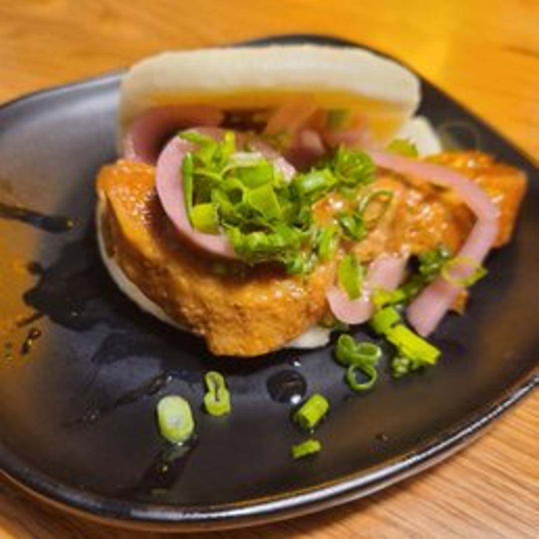A steamed bun filled with tender, braised pork belly, often accompanied by toppings like pickles and a sweet sauce.