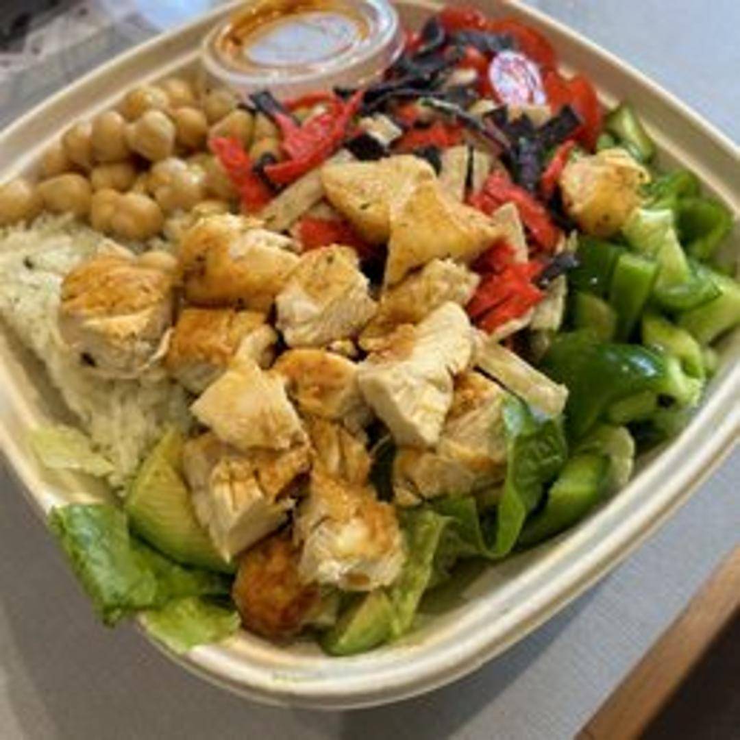 A zesty and satisfying bowl with cilantro-lime rice, black beans, grilled corn, pico de gallo, avocado, and a chipotle-lime dressing. Choose your protein: grilled chicken, steak, or tofu.