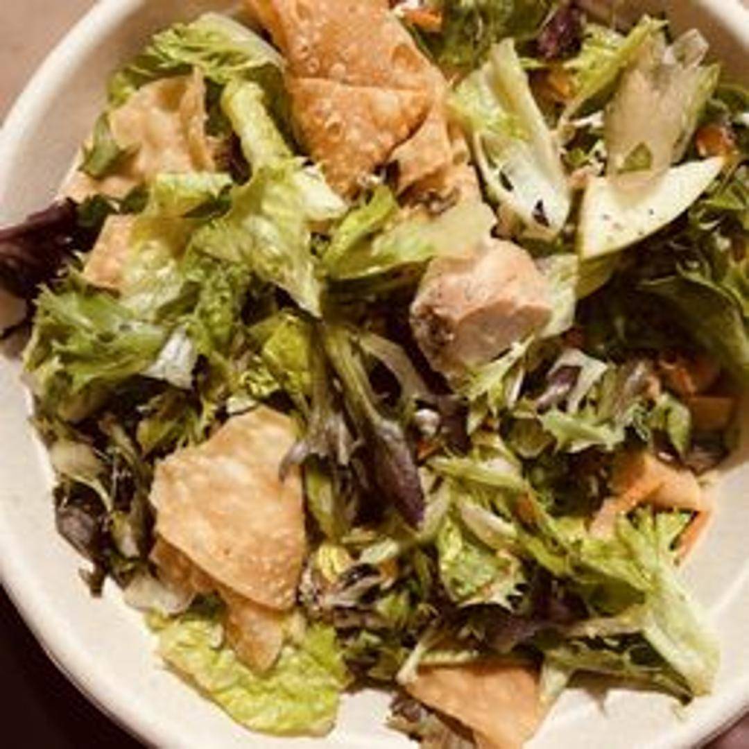 Grilled chicken, shredded carrots, mandarin oranges, crispy wontons, sesame seeds, and sesame ginger dressing.