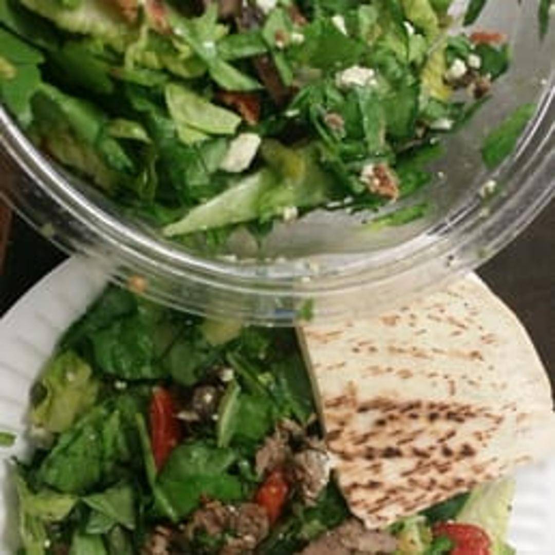 A hearty salad featuring grilled steak, mixed greens, crumbled blue cheese, tomatoes, red onions, and crispy fried onions. Served with your choice of dressing.