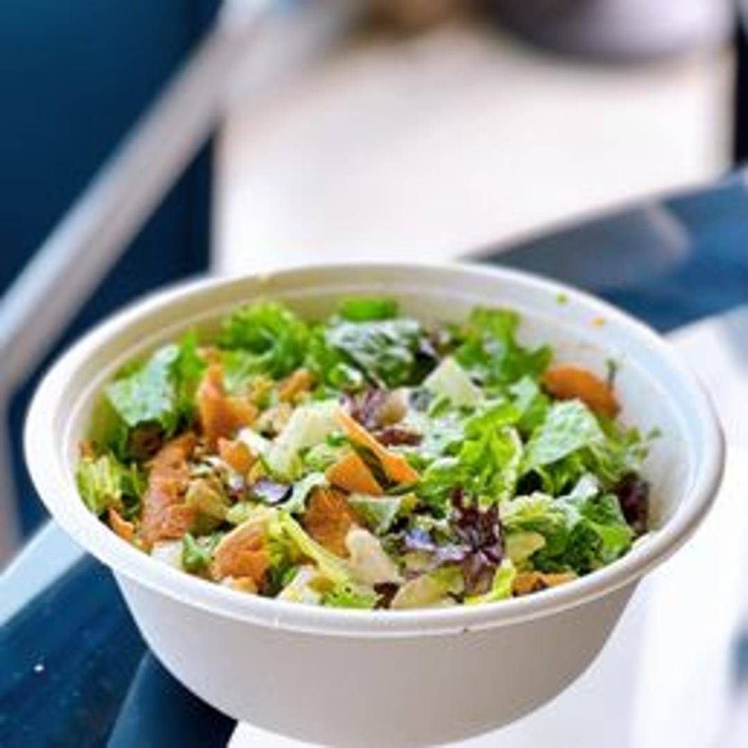 An Asian-inspired salad featuring a mix of greens, mandarin oranges, crispy wontons, sliced almonds, and sesame ginger dressing. Often includes grilled chicken or tofu for added protein.