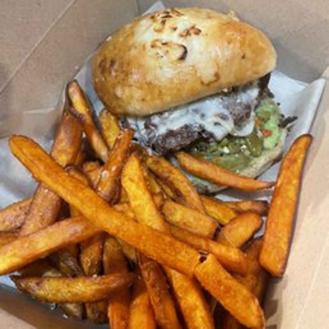 Burger topped with roasted Pueblo chiles, pepper jack cheese, lettuce, tomato, onion, and our signature sauce on a toasted bun.