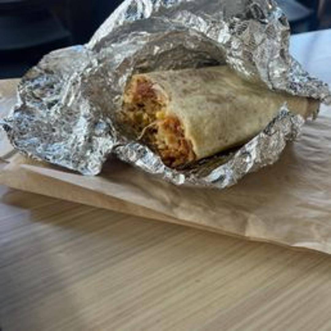 A hearty burrito filled with tender, slow-cooked pork, rice, beans, cheese, and your choice of salsa. A flavorful and filling option providing a good source of protein and carbohydrates.