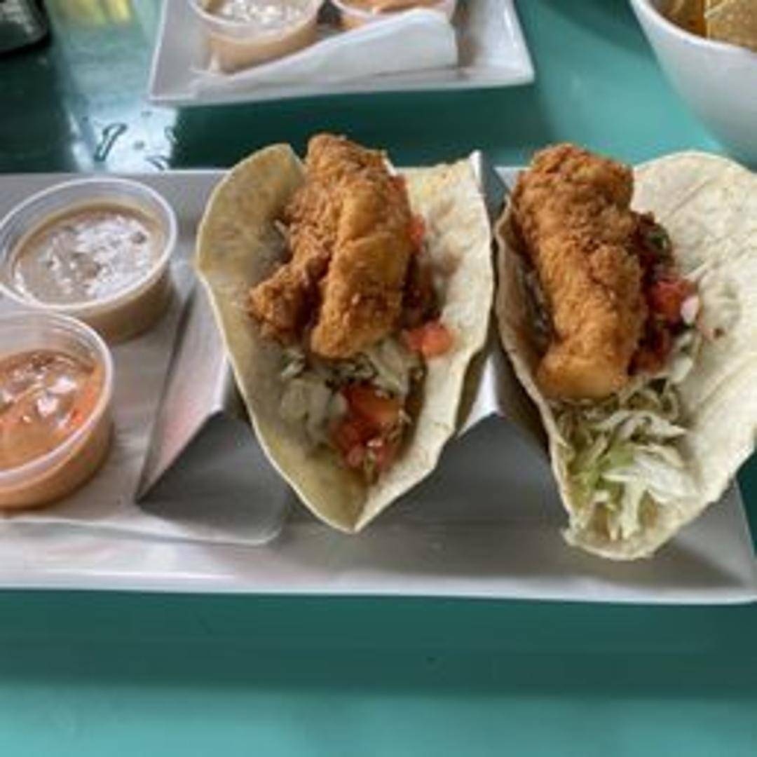 Two soft tacos filled with grilled or fried local catch, shredded cabbage, pico de gallo, and a cilantro-lime crema. Served with a side of tortilla chips and salsa.
