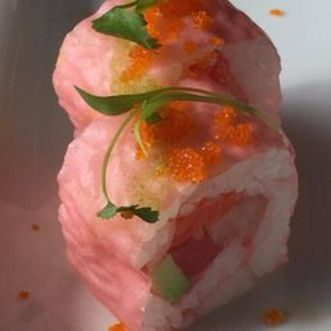 An elegantly presented and flavorful sushi roll, often distinguished by its vibrant pink hue, typically achieved with pink soy paper (mamenori). The roll usually contains a delicious combination of ingredients such as shrimp tempura, spicy tuna, creamy avocado, or crab, complemented by a delicate sweet or savory sauce, offering both visual appeal and a delightful taste.