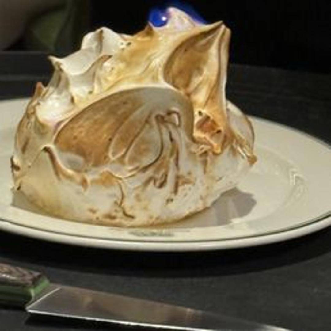 A dramatic dessert experience. Ice cream layered on sponge cake, encased in meringue, and flambéed tableside for a stunning presentation. Serves two.