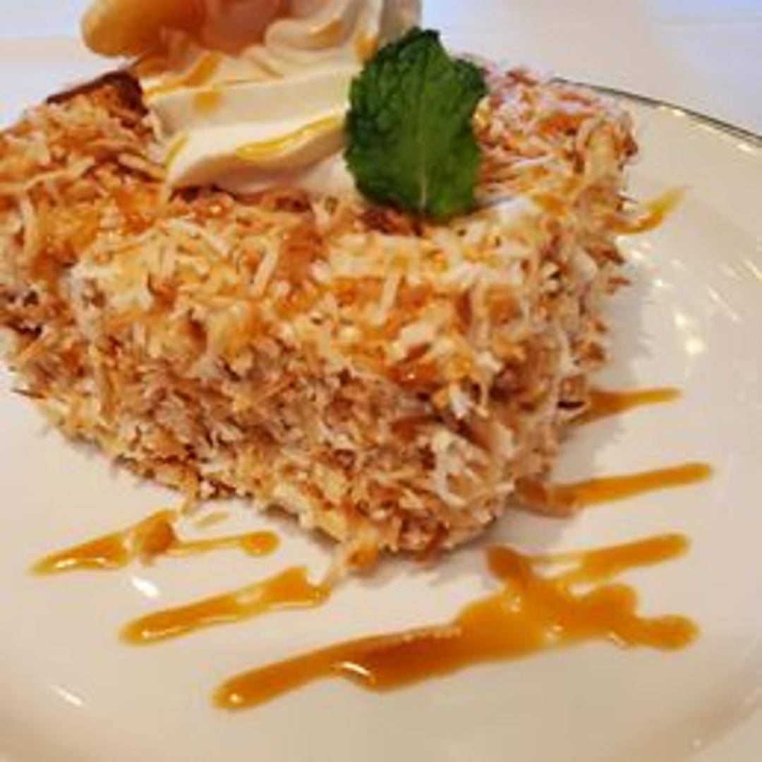 A moist and decadent cake featuring layers of coconut-infused sponge cake, filled with a creamy coconut pastry cream or frosting, and often topped with toasted coconut flakes.