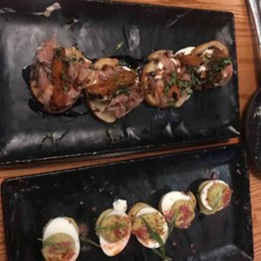 A light and fresh appetizer featuring juicy peaches, lightly grilled to bring out their natural sweetness and a subtle caramelization, served atop crispy toasted crostini. A perfect balance of sweet, tender fruit and crunchy bread, ideal for a warm weather bite.