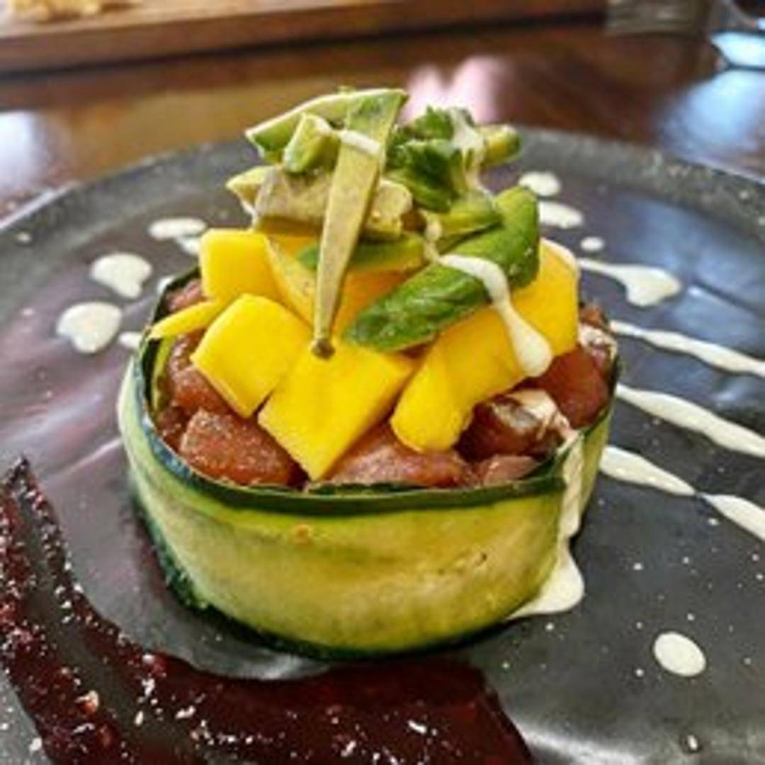 An elegant and refreshing creation from SmokeStacks Cafe. This dish features delicate layers of finely diced, perfectly seasoned tuna, artfully stacked with crisp, fresh ingredients that provide a delightful contrast in texture and flavor. A light yet incredibly satisfying option, showcasing balanced ingredients for a sophisticated culinary experience.