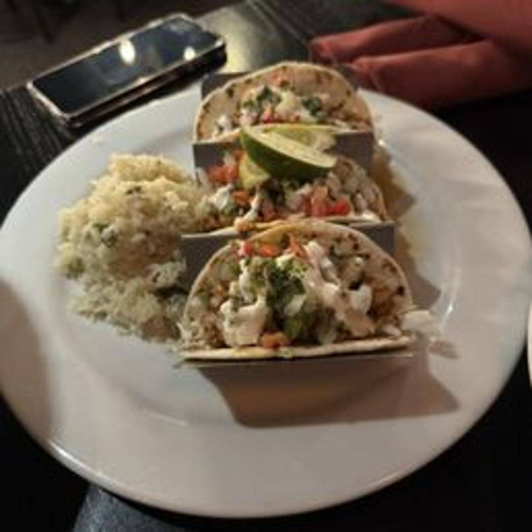 Three corn or flour tortillas filled with crispy, beer-battered cod, shredded cabbage, pico de gallo, and a creamy Baja sauce. Served with a side of rice and black beans.