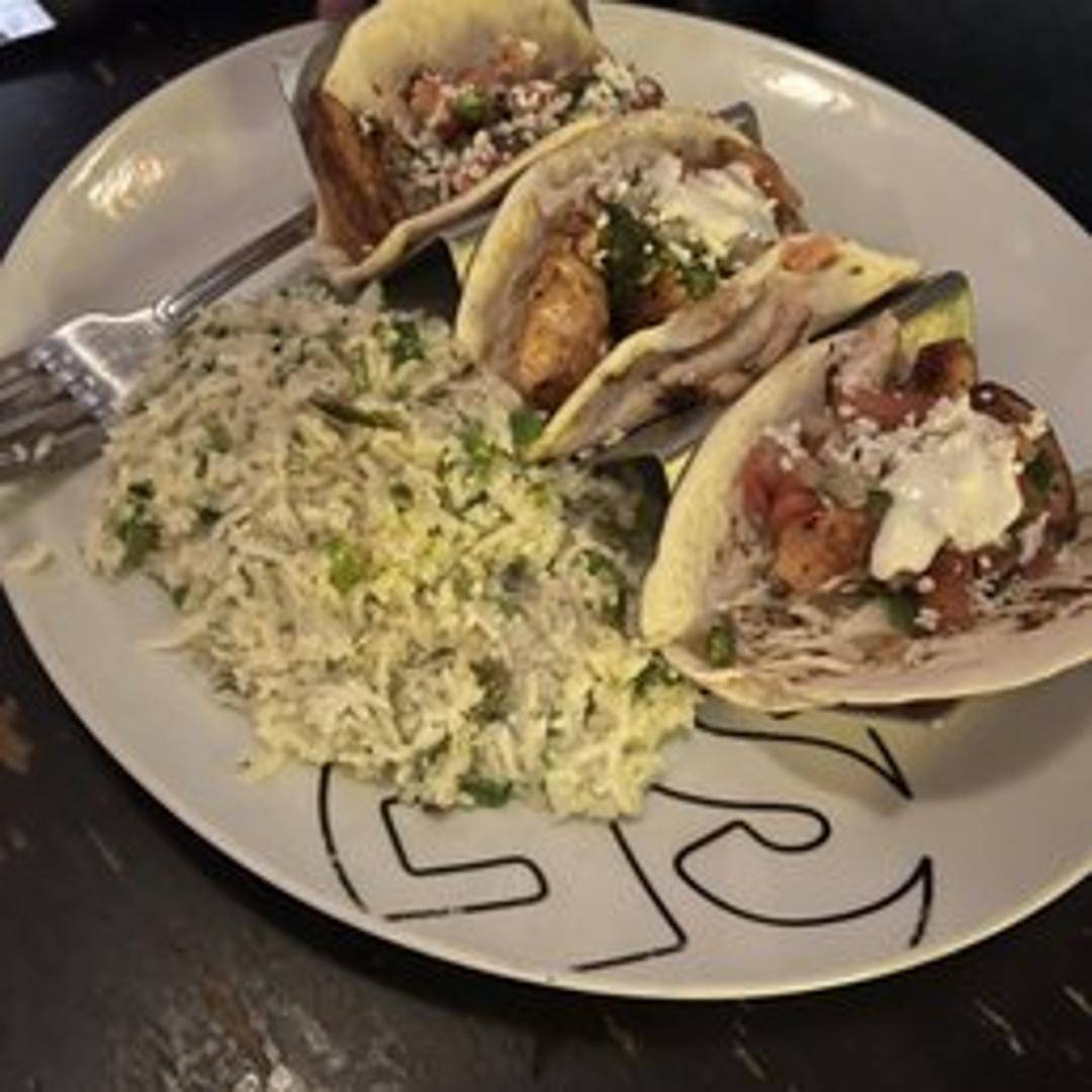 Blackened mahi, cabbage, pico de gallo, chipotle aioli, and cilantro lime rice.