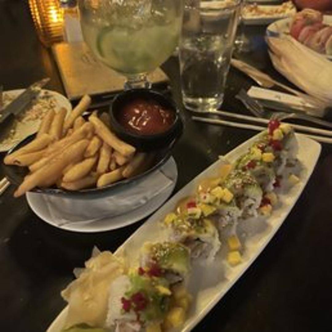 Shrimp, mango salsa, avocado, cream cheese, and coconut flakes.