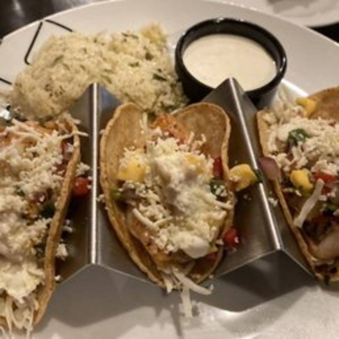 Grilled shrimp, mango salsa, cabbage, chipotle aioli, and cilantro lime rice.