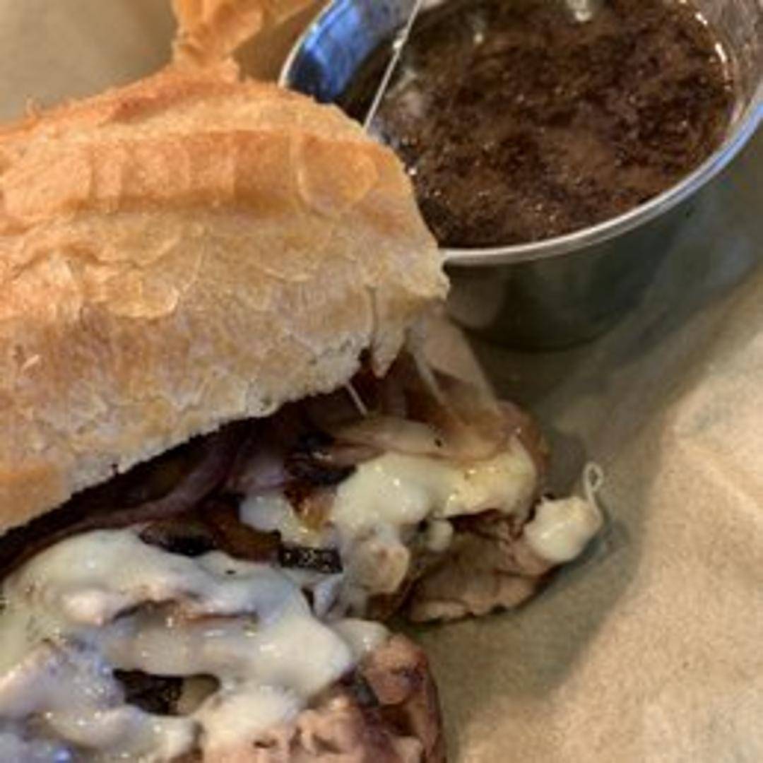 Thinly sliced roast beef and melted provolone cheese on a toasted baguette, served with a side of au jus for dipping.