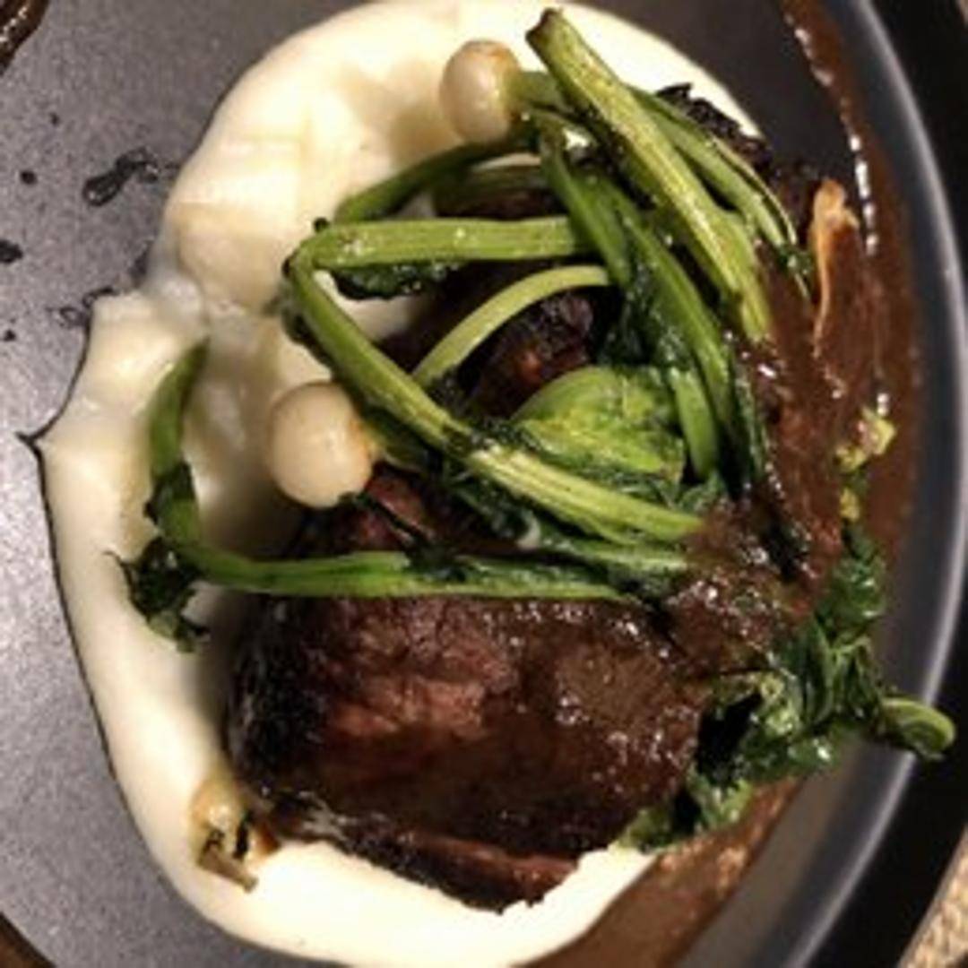 Slow-braised beef short ribs, resulting in a rich, tender, and flavorful dish. Often served with a reduction sauce made from the braising liquid, and accompanied by creamy polenta, mashed potatoes, or other complementary sides. Garnished with fresh herbs.