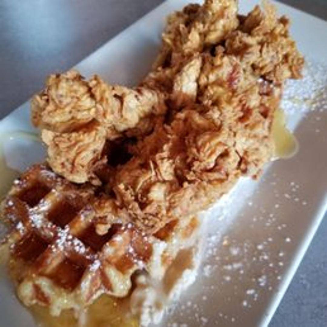 Crispy, golden-brown fried chicken served atop fluffy, lightly sweet waffles. Drizzled with warm maple syrup and dusted with powdered sugar. A perfect balance of savory and sweet.