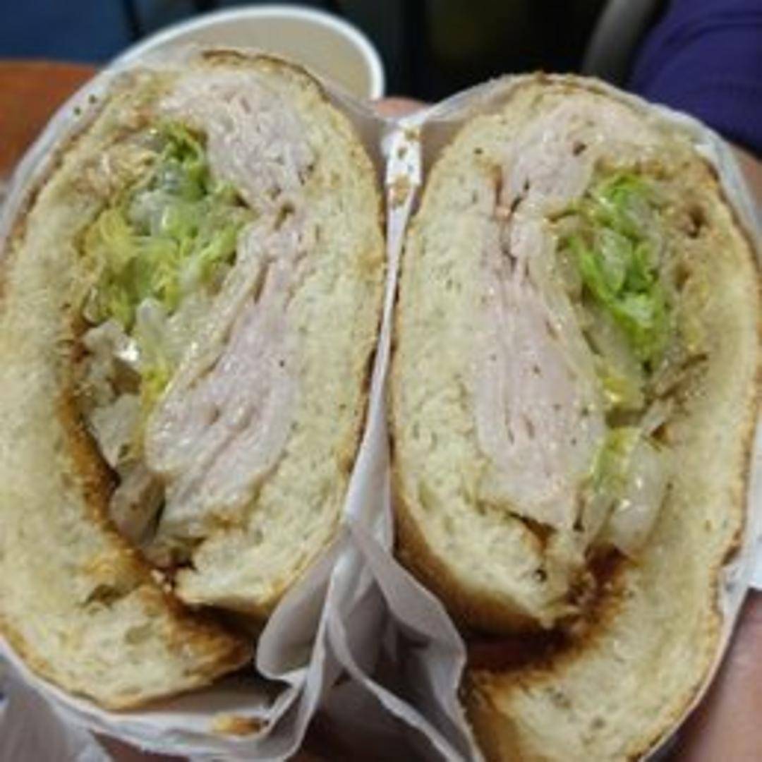 Thinly sliced turkey breast piled high on toasted bread with melted Swiss cheese, lettuce, tomato, onion, Snarf's hot peppers, and Snarf's oil.