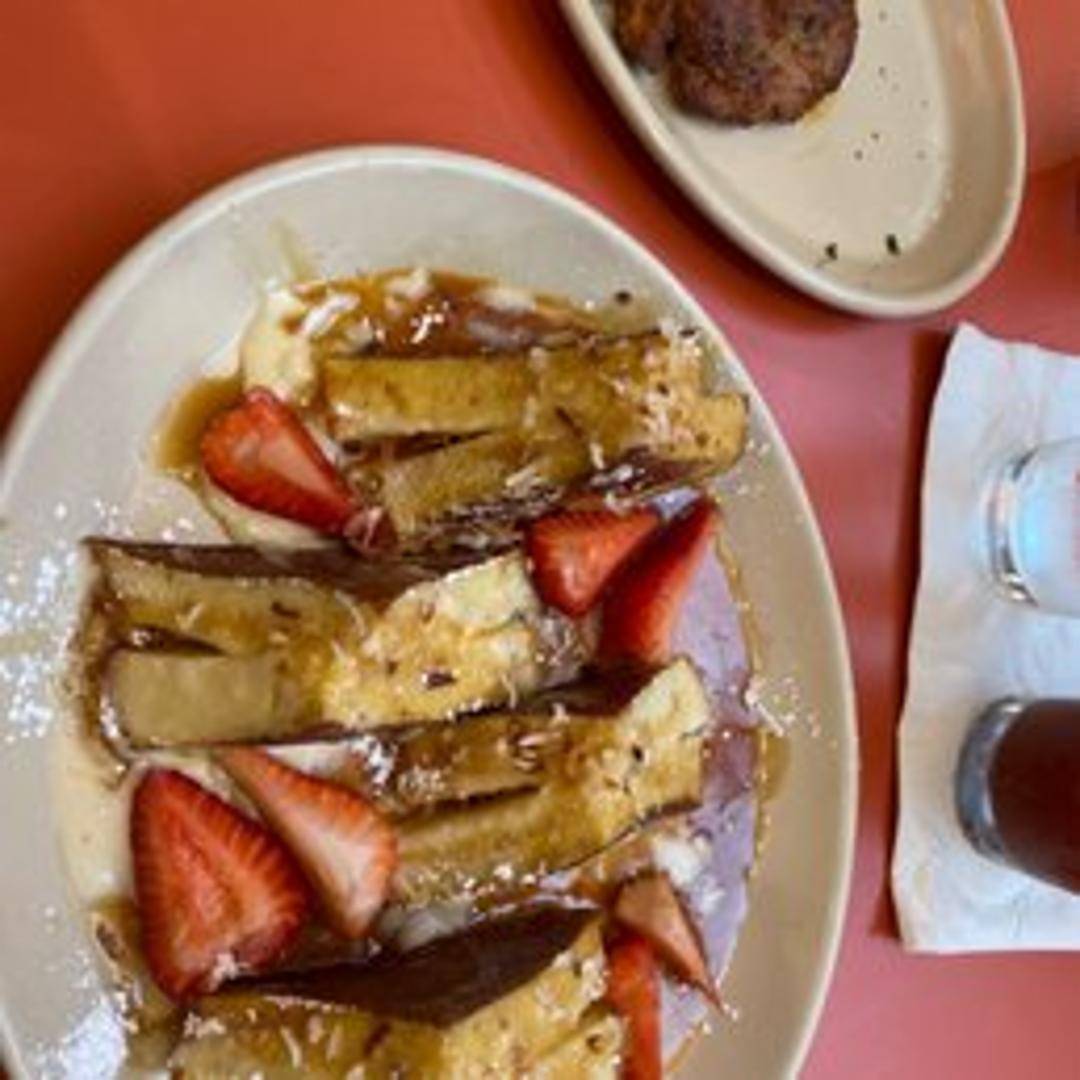 Brioche bread dipped in vanilla batter, grilled golden brown, and topped with mascarpone, seasonal fruit, and caramel sauce.