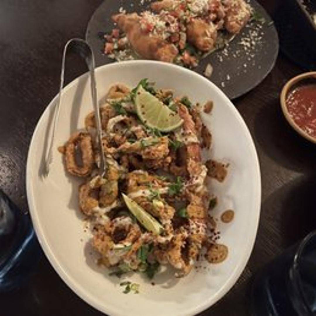Crispy fried calamari served with a tangy dipping sauce. Features tender calamari rings and tentacles in a light, golden batter. Garnished with fresh herbs.