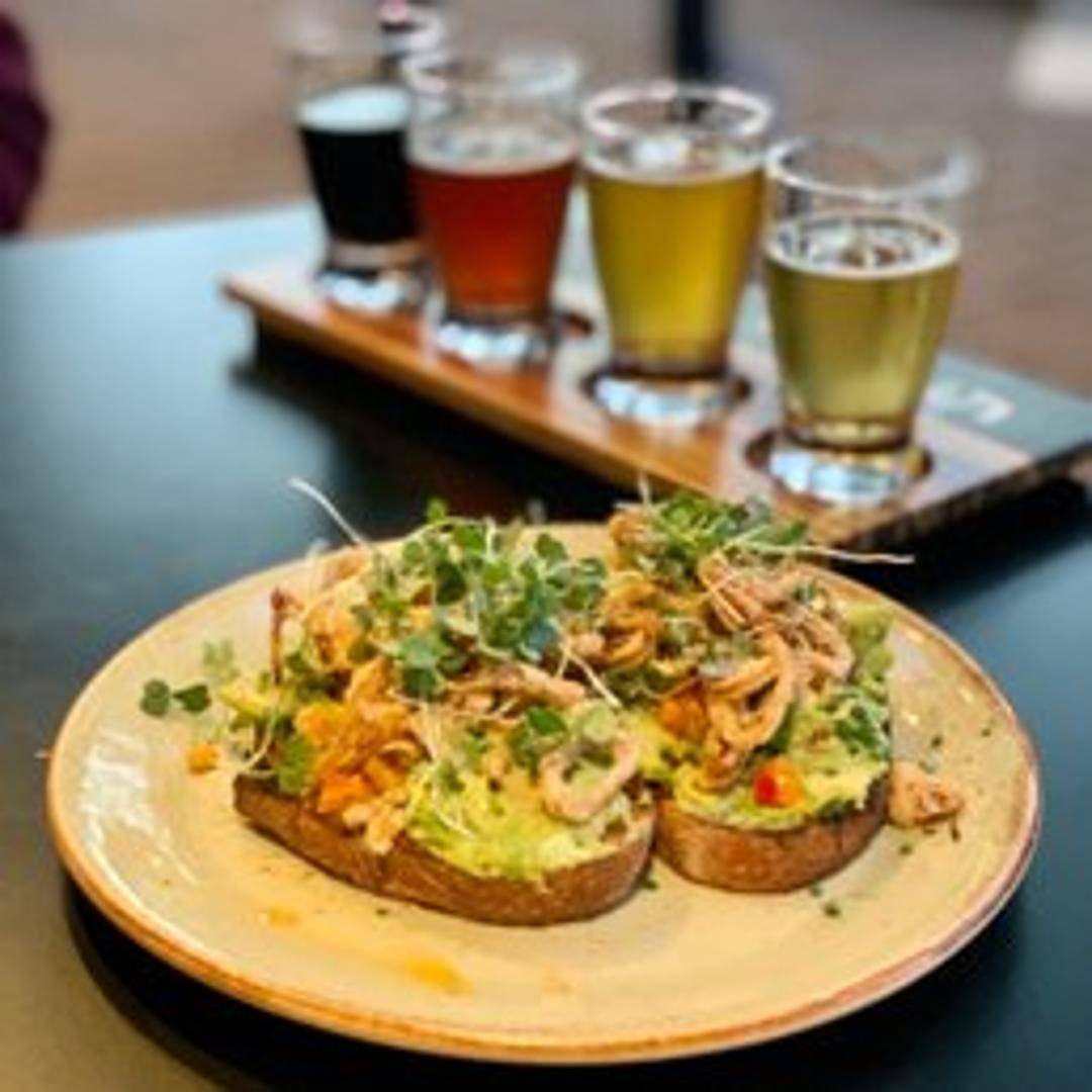 Toasted baguette slices topped with creamy, fresh avocado, diced tomatoes, red onion, and a drizzle of balsamic glaze. Garnished with fresh basil.