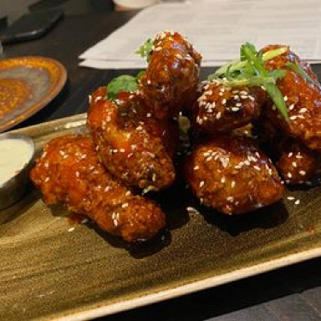 Crispy and juicy fried chicken glazed with a sweet and spicy Korean-inspired sauce. Served with a side of pickled radish.