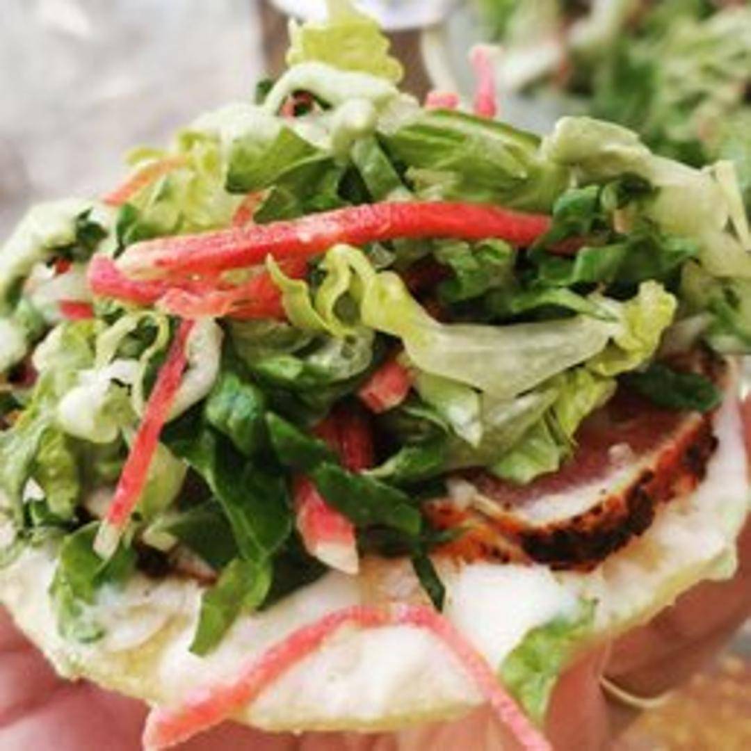 Crispy tostadas topped with fresh, seared ahi tuna, vibrant avocado, spicy aioli, and a sprinkle of sesame seeds. A delightful combination of textures and flavors.
