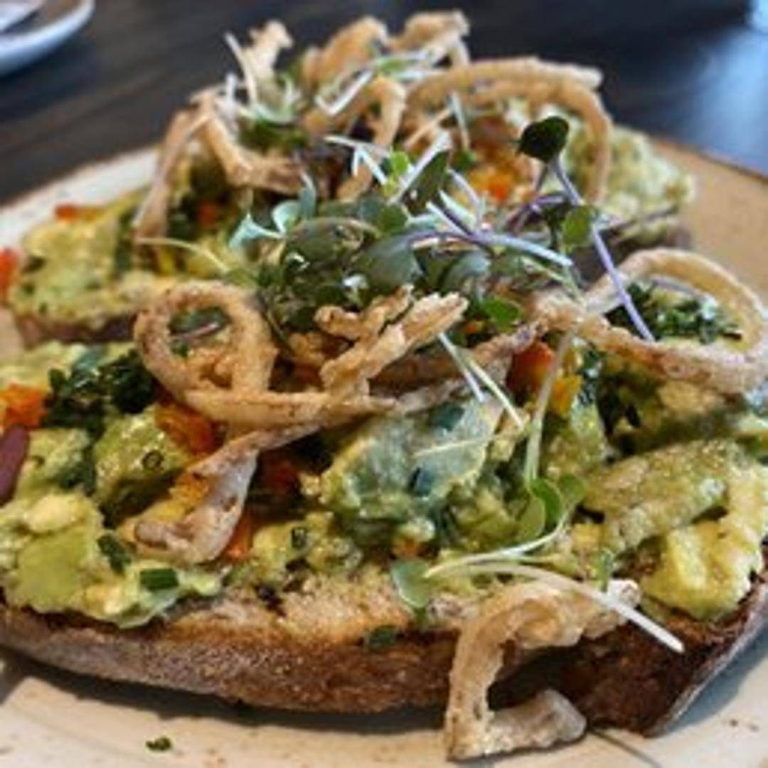 Toasted artisanal bread topped with perfectly ripe avocado, seasoned with salt, pepper, and chili flakes. Often includes additions like microgreens, everything bagel seasoning, or a drizzle of olive oil.