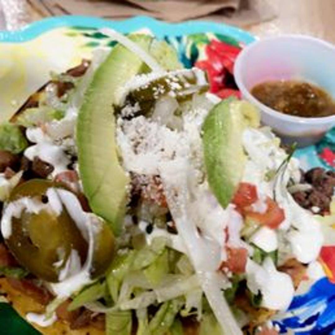 Crispy, flat tortillas topped with various fresh ingredients such as refried beans, shredded lettuce, your choice of meat (chicken, beef, or pork), diced tomatoes, onions, avocado or guacamole, sour cream, and crumbled cheese.