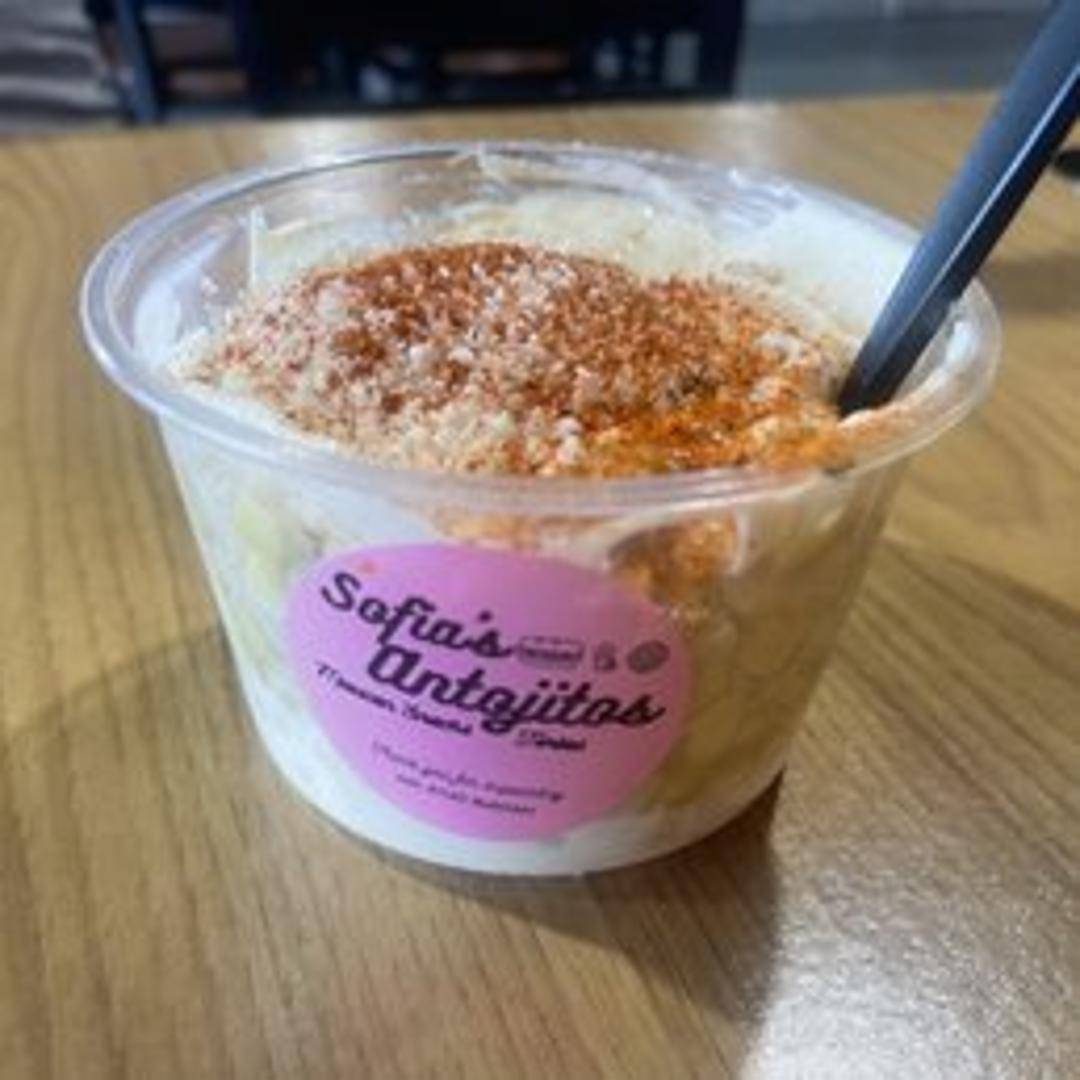 A popular Mexican street food consisting of sweet corn kernels cut from the cob, mixed with mayonnaise, cotija cheese, chili powder, lime juice, and sometimes other ingredients like cilantro and hot sauce. Served in a cup.