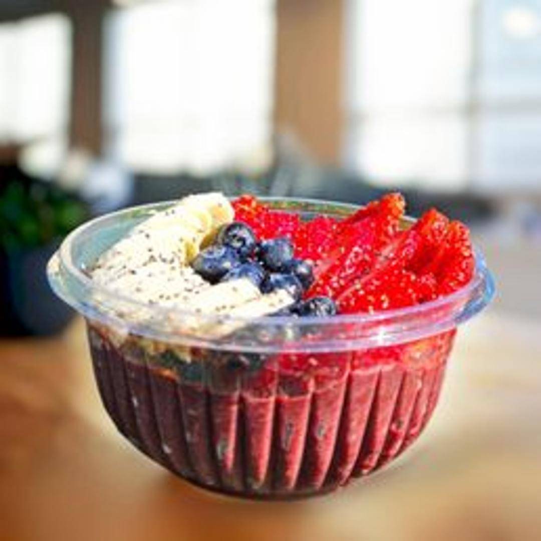 A blended base of acai berries topped with granola, fresh fruit (such as strawberries, blueberries, and bananas), shredded coconut, and a drizzle of honey or agave.
