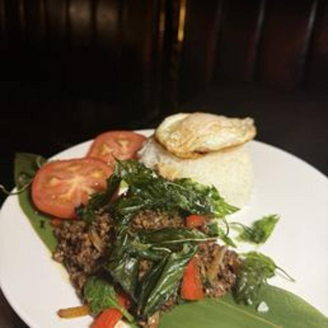 A flavorful stir-fry with your choice of protein, holy basil, garlic, chilies, and a fried egg served over rice.