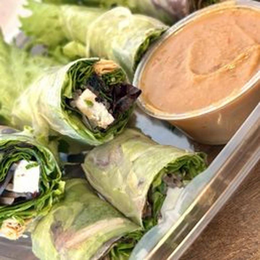 Fresh rice paper rolls filled with vermicelli noodles, fresh herbs, crisp vegetables, and plant-based protein. Served with a peanut dipping sauce.