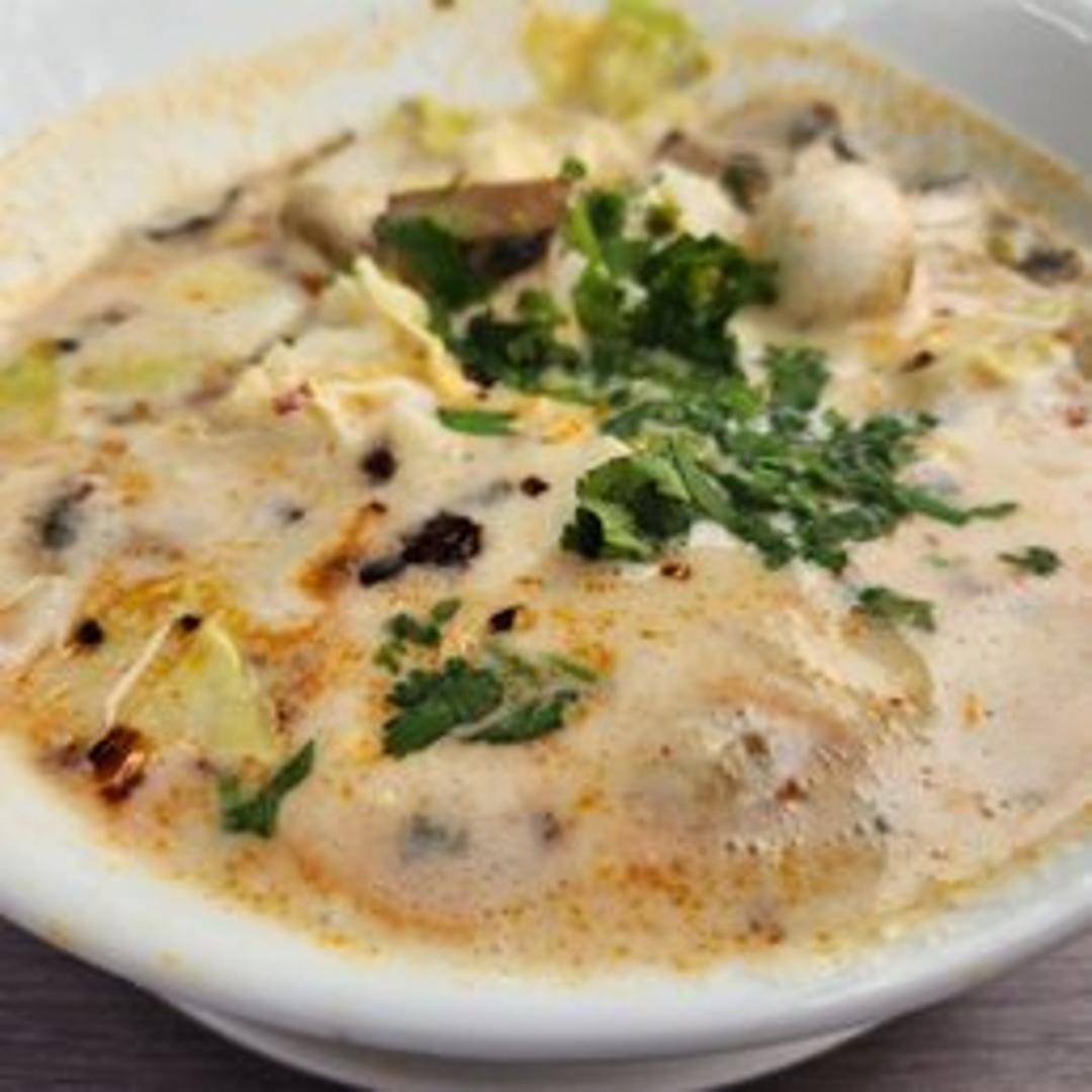 A creamy and flavorful coconut milk soup with mushrooms, tomatoes, galangal, lemongrass, kaffir lime leaves, chili, and your choice of protein (tofu or vegetables). Topped with cilantro.