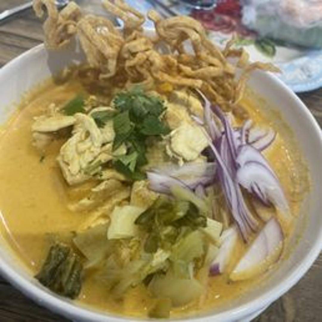A Northern Thai specialty. Egg noodles in a creamy coconut curry broth, topped with crispy noodles, pickled mustard greens, red onion, and a wedge of lime. Often includes your choice of protein.