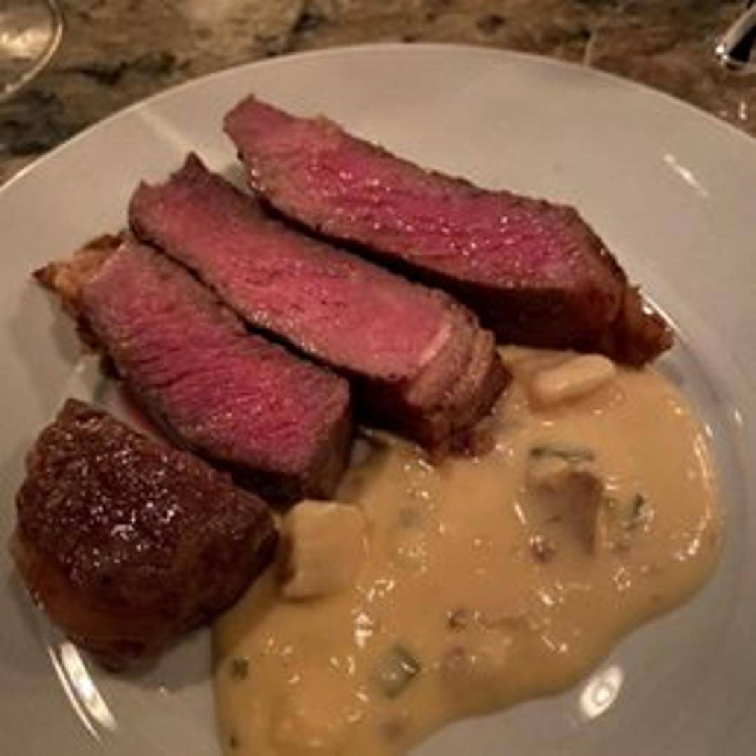 A perfectly grilled New York Strip steak, cooked to your preferred temperature, seasoned with herbs and spices, and served with your choice of side.