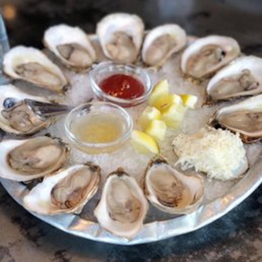 Freshly shucked, plump oysters served on the half shell, presented on a bed of ice. Each oyster offers a pristine taste of the ocean, with a crisp, briny liquor and a clean, refreshing finish, typically accompanied by classic mignonette, cocktail sauce, and lemon wedges.